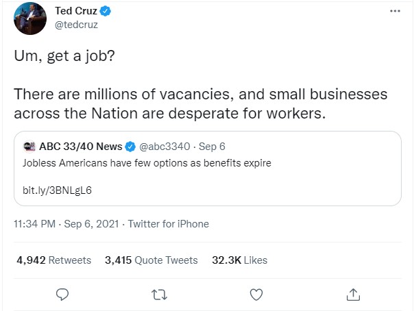 Ted Cruz tells unemployed to get a job given millions of job openings