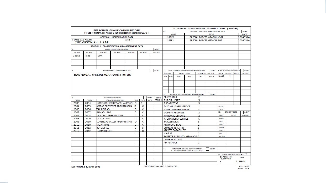 Oh, I should not be questioning things I know nothing about, as I’ve never even seen an Army SeAL, much less talked to one, but I do remember seeing an Army Special Forces brochure once, and 18E didn’t translate to anything medical, but I suppose that’s why he got a Combat Action Badge, as opposed to the CMB, or CIB that the 18series normally get.