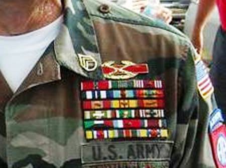 1. There is more bogus than the red badge. He’s wearing an airborne patch but no jump wings. And I’m just guessing here but is there a repeat on the National Defense Service Medal or only one award, punto.