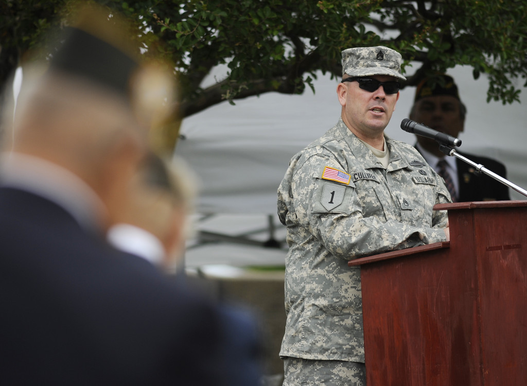 Former Marine Staff Sgt. Jonathan Cullifer speaks to the audience Monday at the Memorial Day service at Vacaville-Elmira Cemetery in Vacaville. (Robinson Kuntz/Daily Republic)