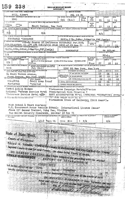The items that are on the DD214 are a little hard to read, and starting at the top, Reason for Separation: Reason of Unfitness: next item is the CAR, Navy Accommodation Medal with “V’ device for Valor. Claiming those awards and others provided Ruiz with Public recognition and a potential financial windfall, Also claiming to be the Speech writer for a New York candidate for the Governors office. Contacting them, no such person in employment. Serving in Vietnam with whatever MOS you means that you should be proud of that fact and that you survived the experience says a lot. Embellishing your awards and using that for personal gain is wrong. Falsifying a Federal Document hope it will bring some legal question to your public recognition.