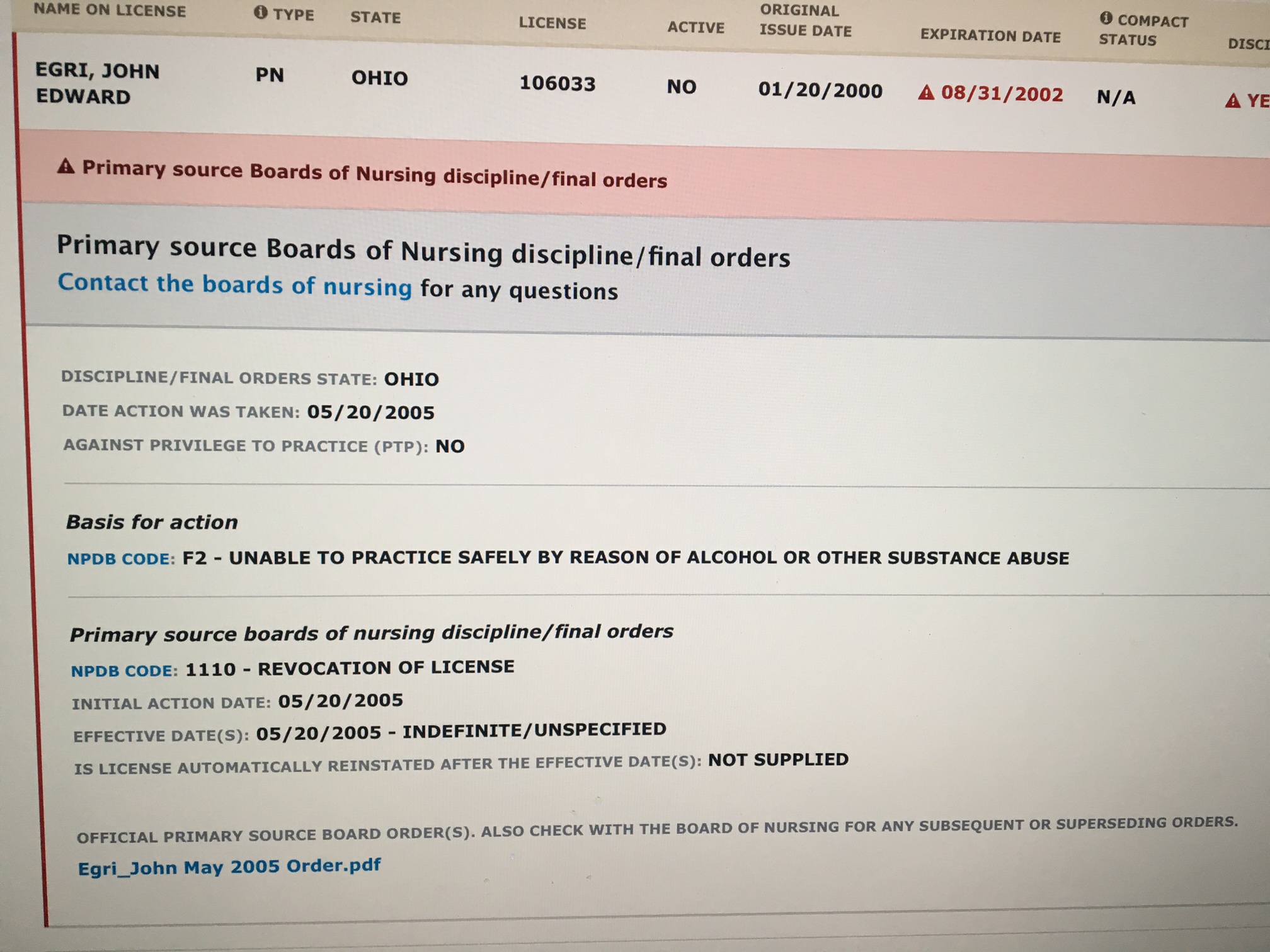 John Egri is or was my ex husband and though I divorced him for being a pathological narcissist who abused drugs and his nursing license, he continued to harass me and my son for years after our divorce.