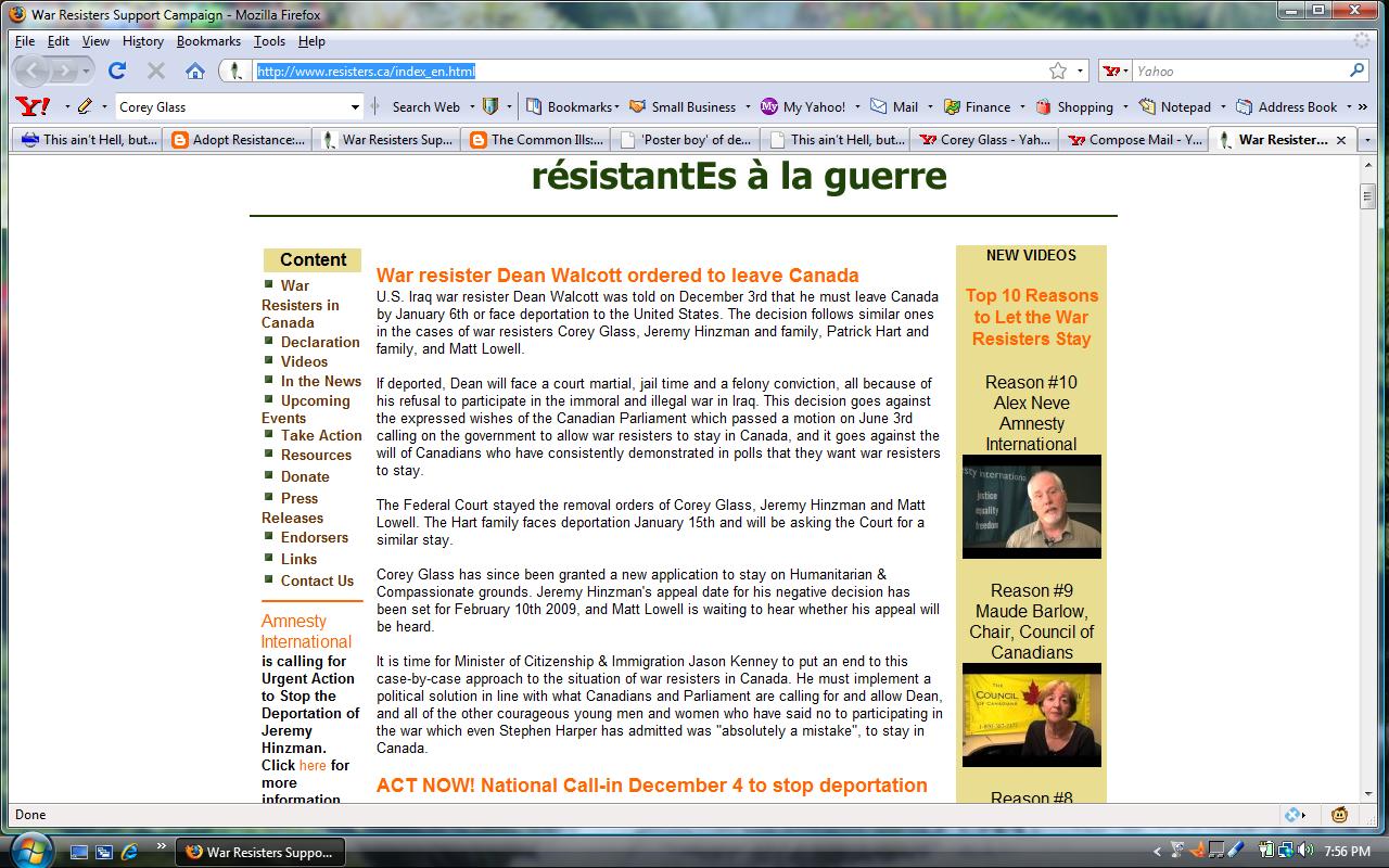 Corey Glass has since been granted a new application to stay on Humanitarian & Compassionate grounds. Jeremy Hinzman’s appeal date for his negative decision has been set for February 10th 2009, and Matt Lowell is waiting to hear whether his appeal will be heard.