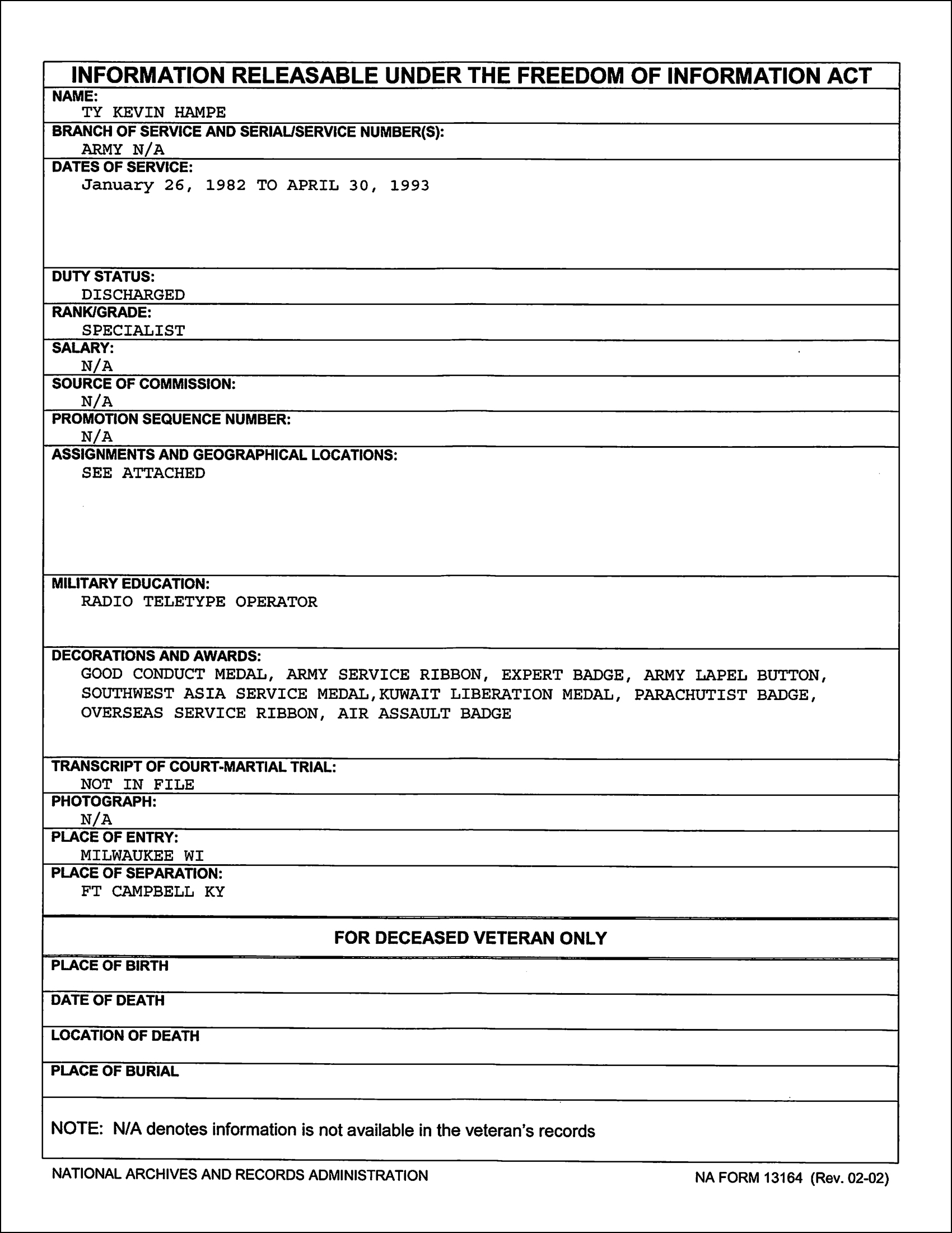 Perhaps the NPRC clerk decided Hampe was undeserving of the highly coveted and rarely awarded NDSM. The POSer’s membership in our brotherhood has been revoked!