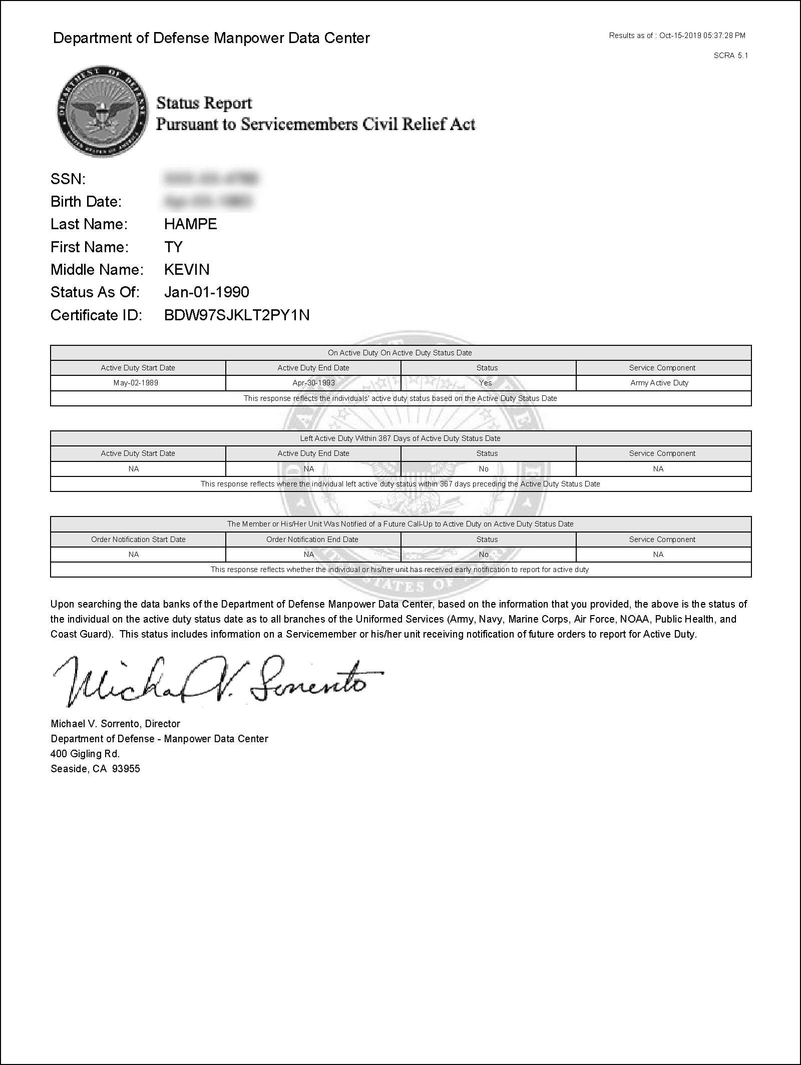 Additionally, Hampe’s LinkedIn page claimed that he was in the National Guard from 2001-2011 and the NPRC did not return results for that period. The DoD Manpower Data Center was systematically searched from 1994 to PRESENT and there was no indication of active duty. NPRC would have picked up any National Guard service, regardless of active duty.