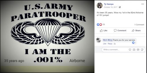Then, there are claims by implication. Although he doesn’t state the claim, he will post something to his Facebook account and accept thanks without correcting anybody should they make an assumption that wasn’t true. He did this with Airborne, the 82nd, the Purple Heart medal and the Battle of Mogadishu.