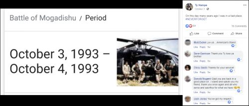 According to records that were obtained from the NPRC and DoD Manpower Data Center, Hampe was discharged from the U.S. Army on April 30, 1993 and the Battle of Mogadishu was from 3-4 October 1993.