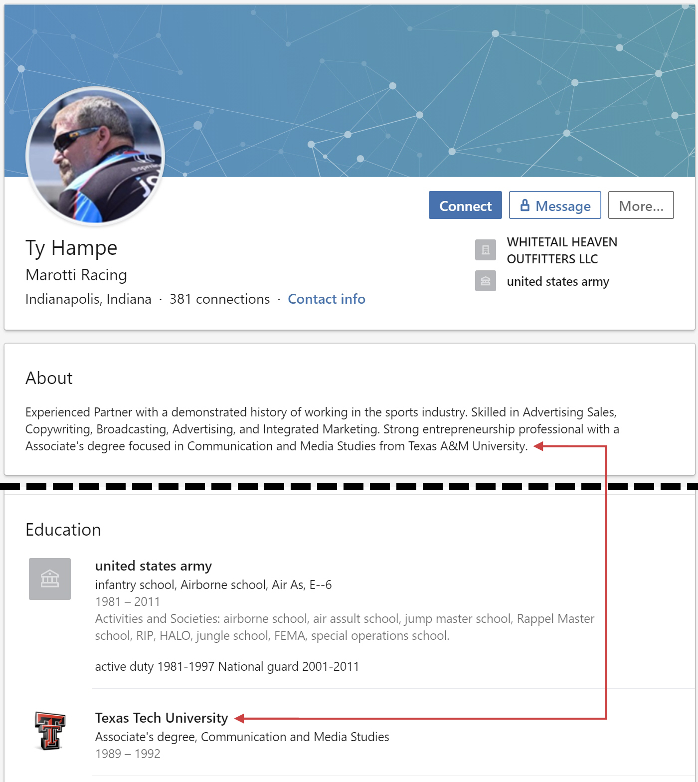 Military records for Ty Hampe show that he served in the U.S. Army from January 26, 1982 to April 30, 1993, so less than the 12 years that his service stripes claim and less than the 20 years he claims on LinkedIn.