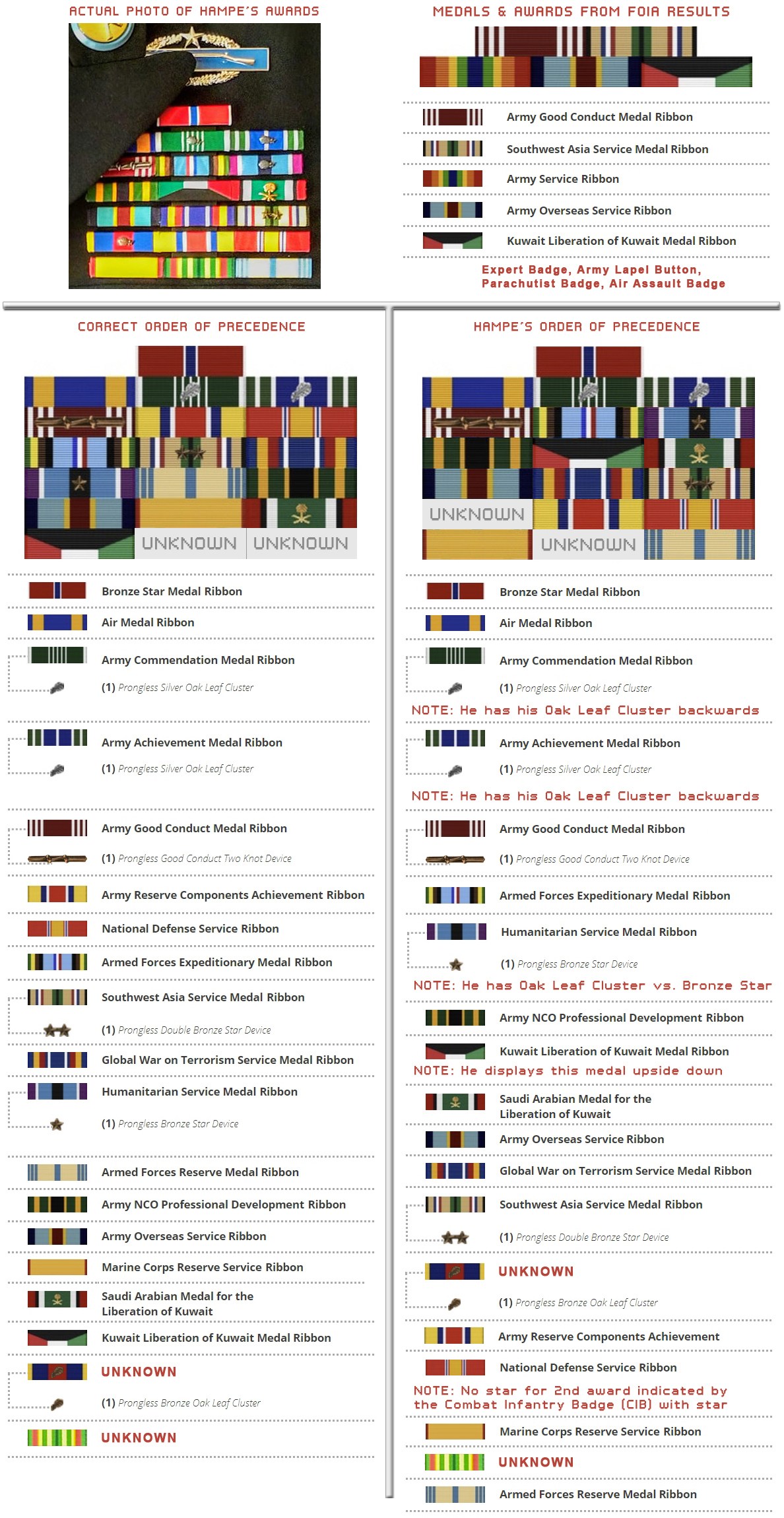 Of concern and of violation of the Stolen Valor Act is the Combat Infantryman Badge (CIB), especially with the star designating a second award. This was not found in Hampe’s official military records.