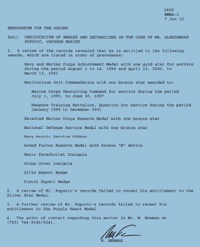 @170 Thanks for posting the letter regarding awards claims. I happen to personally know the individual that signed off on it. He is a former Marine Mustang ( Was a grunt and DI as a Sgt, got picked up for MCEP and got out as a 1st Lt) who works in the awards branch in Quantico.