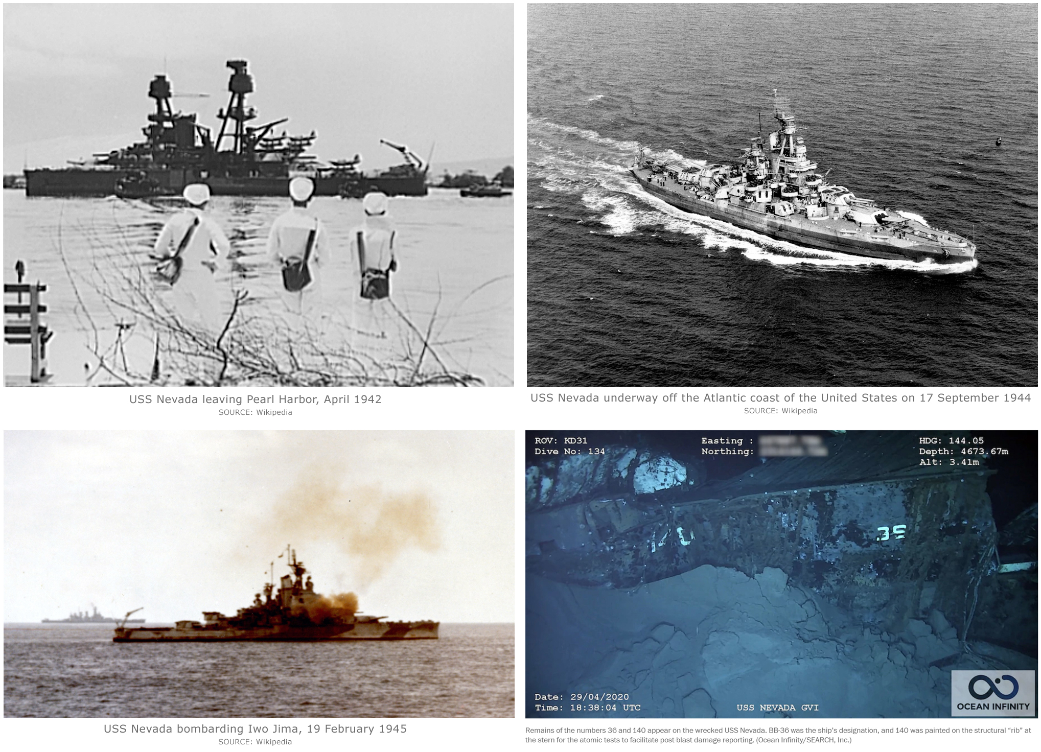 Nevada was found in 15,000 feet of water, purposely sunk by the Navy in 1948 after a career that spanned three decades of service, from World War I to the atomic bomb. – article