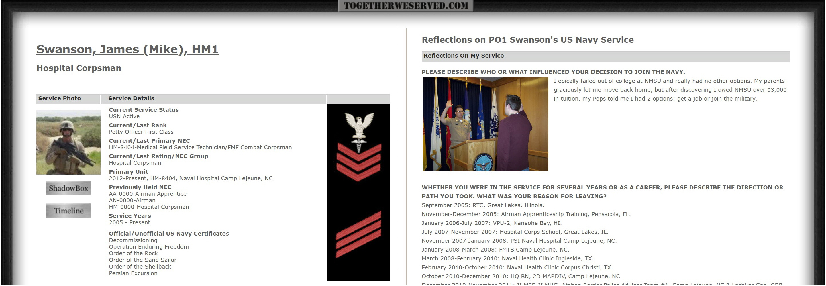 The folks at MilitaryPhony send us their work on James Michael “Doc” Swanson. He usually goes by “Mike.” Swanson claims on his Together We Served (TWS) profile that he was an HM1 (E-6).