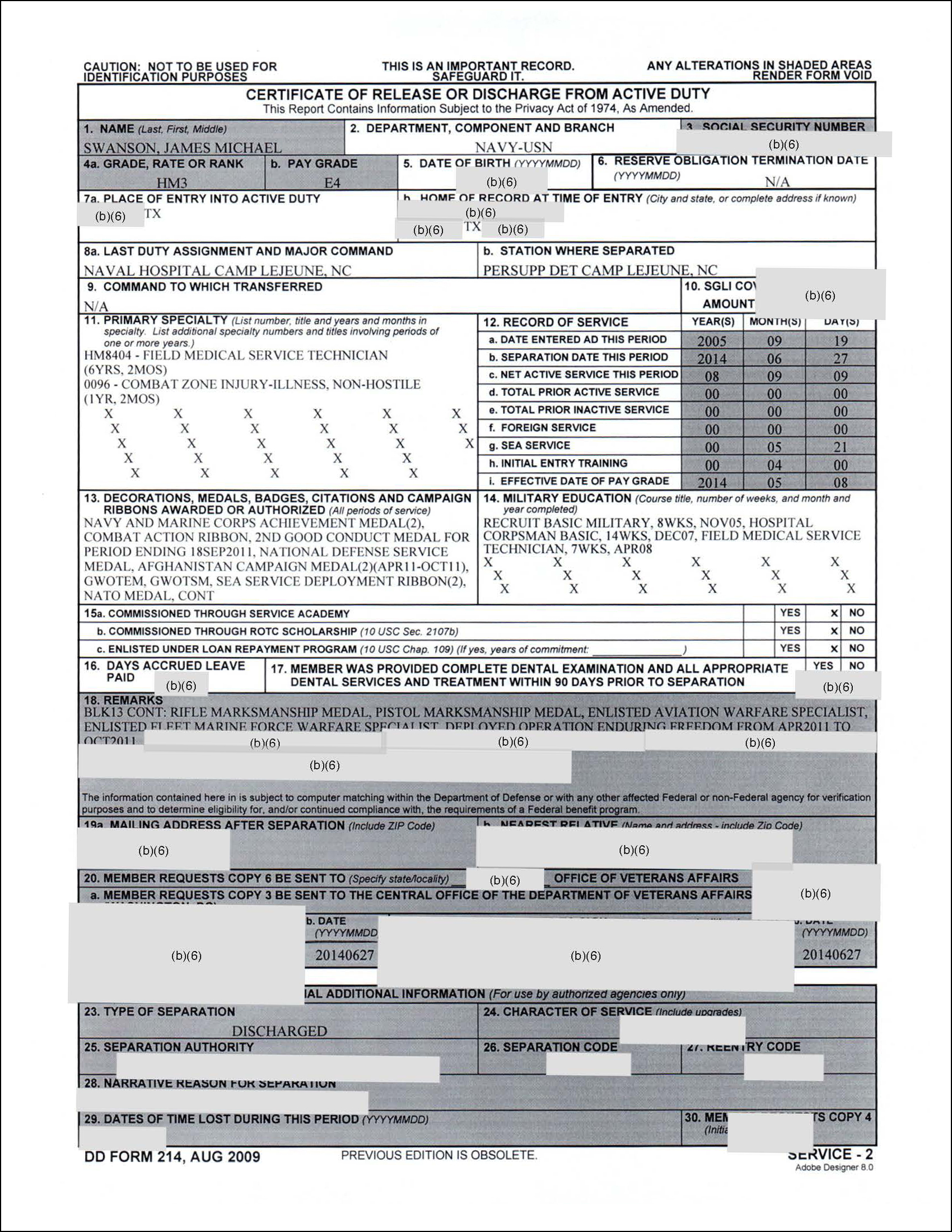 3) Discharge: It is clear the James Michael Swanson was DISCHARGED from active duty not medically retired.