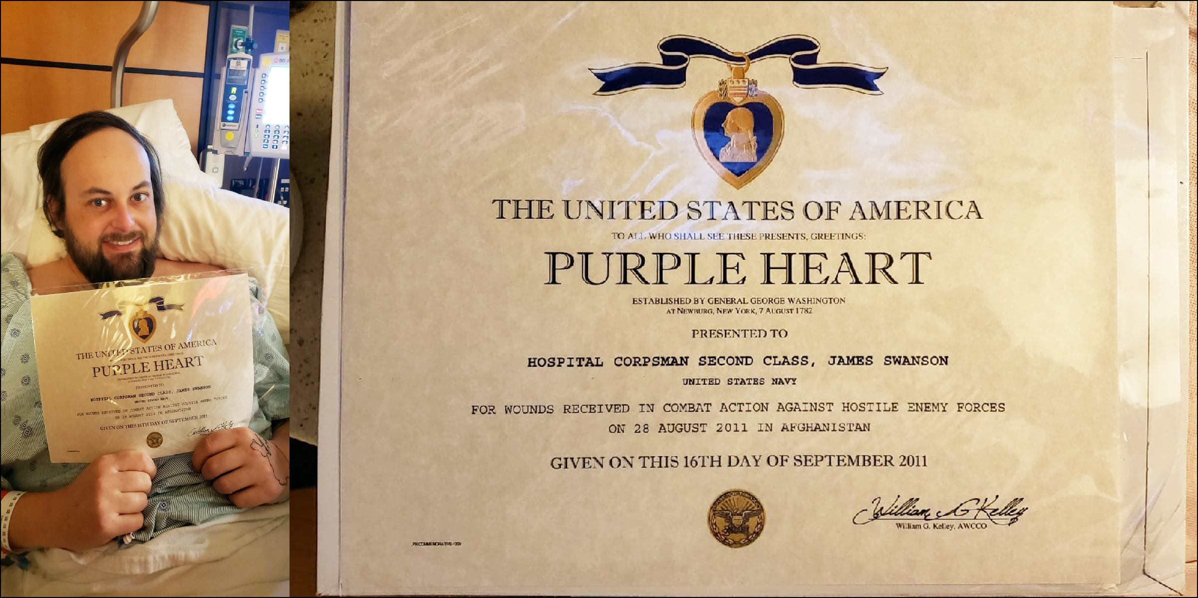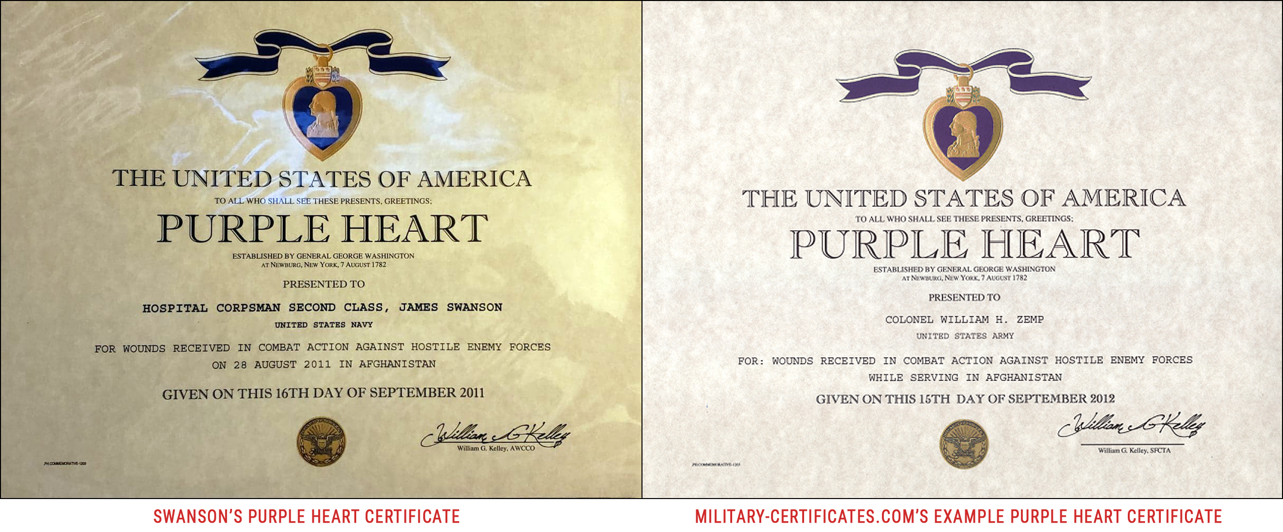 There is compelling evidence that Swanson ordered the fake Purple Heart certificate from https://military-certificates.com/purple-heart-medal-usmc.htm There are several reasons we know this to be true. As just one example, his certificate is signed by “William G. Kelley” and this is the same signature on the example certificate at military-certificates.com