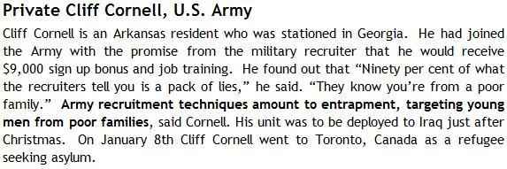 Last night we discovered from our buddy, Just A Grunt that Cliff Cornell, the Arkansas deserter who broke into tears for a local news station wasting his time trying to take a few days off between the time Canada tossed his sorry ass out and he turned himself in to Fort Stewart, GA authorities, got off easy with a twelve month sentence yesterday. The other deserter who absconded to Canada, Robin Long got 15 months.