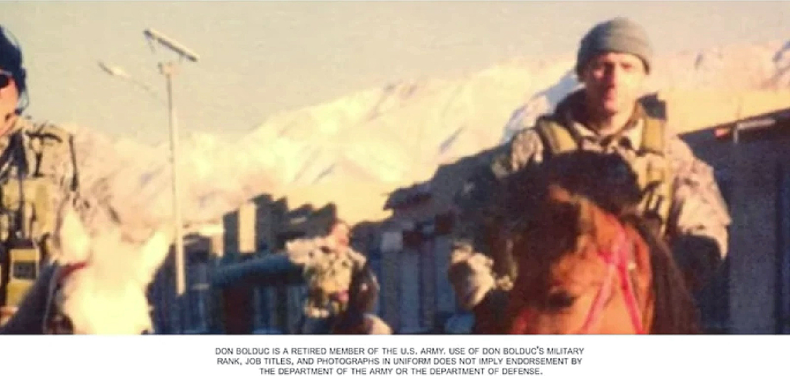From donbolduc.com: “He led one of the first groups in Afghanistan after the 9/11 attacks, riding on horseback to take control of the southern Afghan region from the Taliban.”