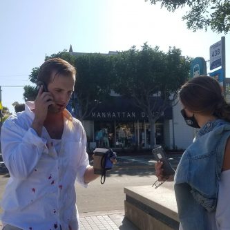A couple of guys sit down to enjoy their meal. They engage in conversation with a man and a woman about masks. The exchange gets heated. One of the men, not wearing a face mask, ends up as a target of thrown coffee. The man retaliates against the couple.