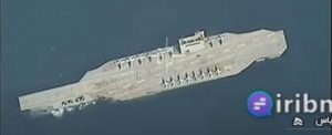 Mock US naval carrier sinks in shallow water at entrance to Iran’s main naval port, presenting danger to any ship which passes over it.