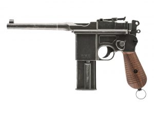 The C96 depicted is likely the Schnellfeuer model, which was full-auto. That button on the side of the frame is prolly the selector switch. They are a class III weapon. Except, the magazine has .177 engraved on it, a pellet gun caliber. Also, the “WWII” engraving on the frame makes me think this a pellet gun look- alike. I have a 9mm C96, which is the most accurate nine I own.