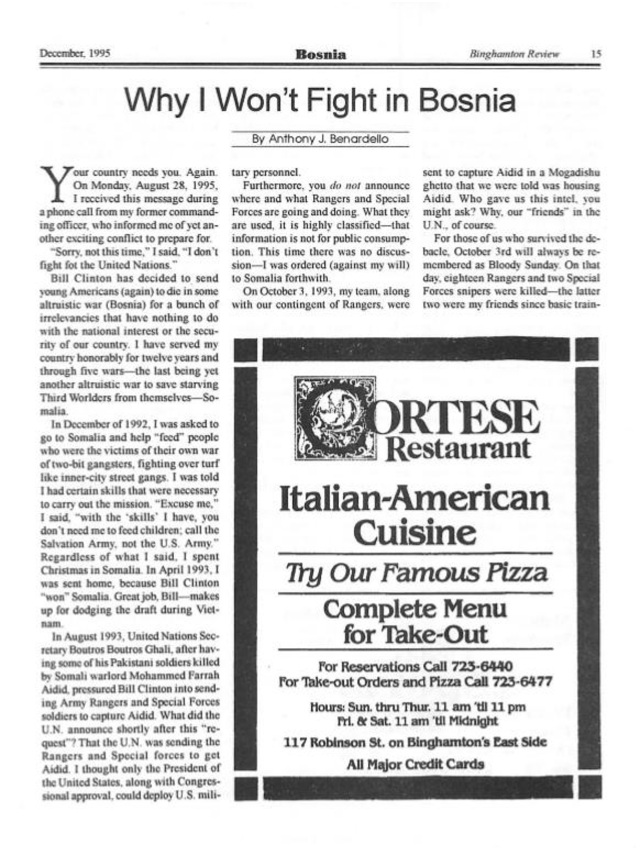 In another op-ed for this same school publication, the Binghamton Review, he explained why he refused to fight in Bosnia, detailing his experience in Somalia during The Battle of Mogadishu as seen in the movie “Black Hawk Down.”