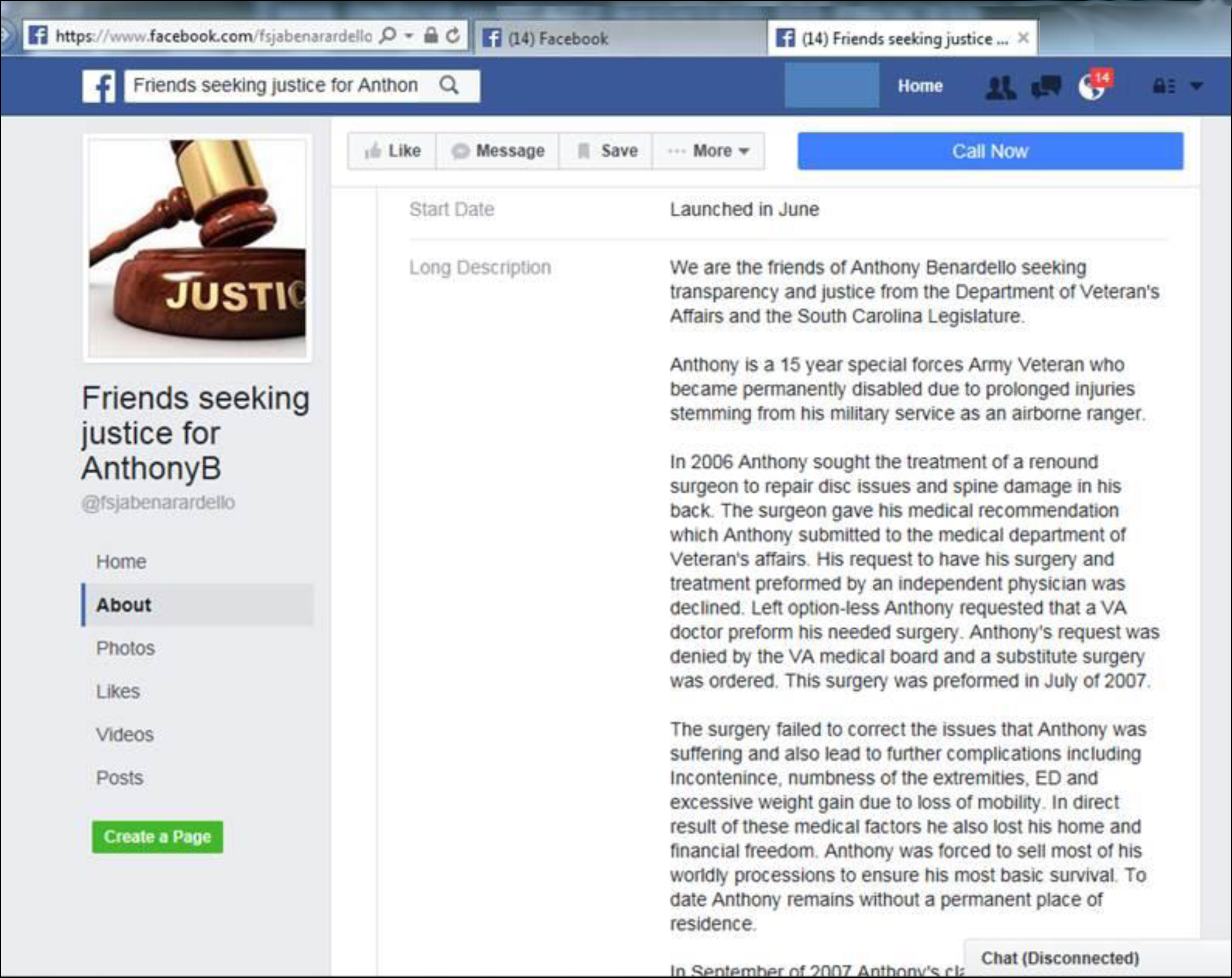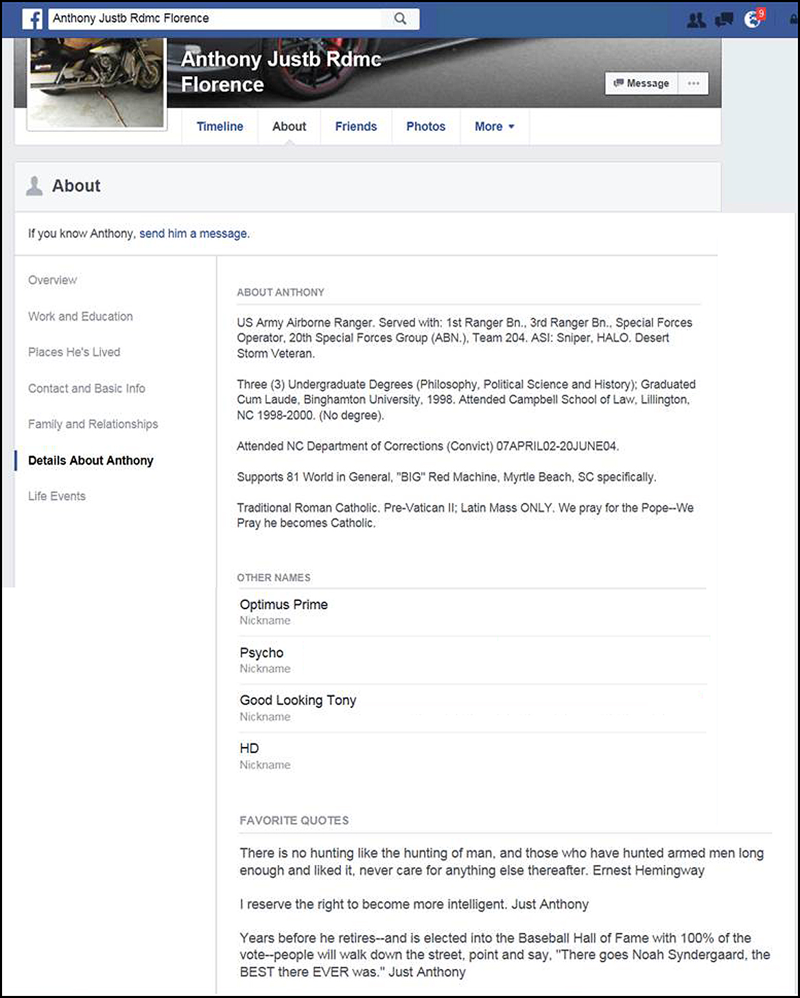 His Facebook profile was associated with him based on his high school alumni page profile. He made similar claims as before and also claimed to be a Desert Storm Veteran.