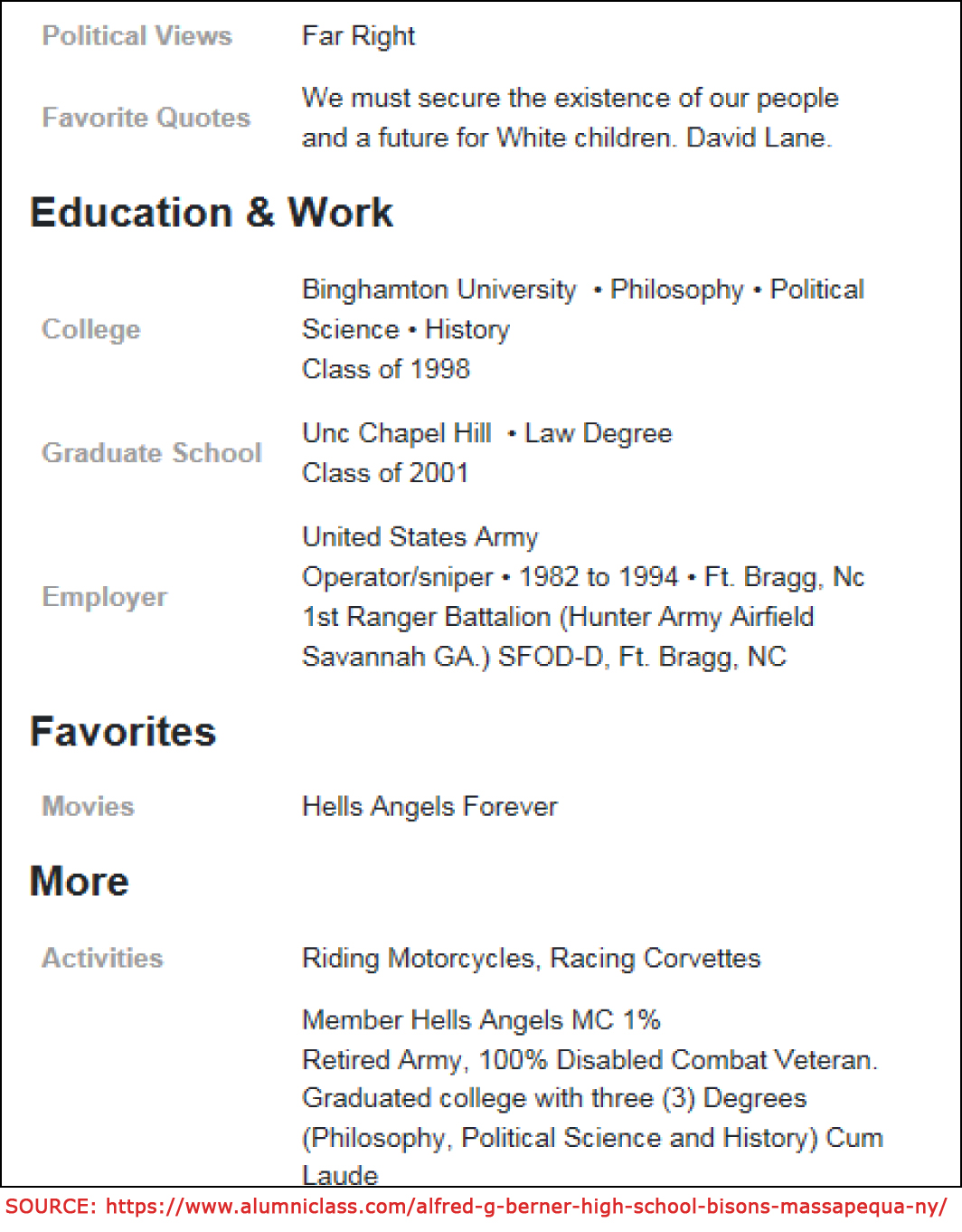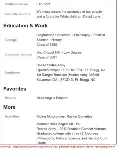 On his high school alumni page, he claims his favorite quote is one made by white supremacist David Lane: “We must secure the existence of our people and the future for White children.”