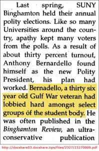 Good ol’ Tony seems to have packed a lot of runnin’ and gunnin’ into his military career. After leaving the military he went to college at the State University of New York at Binghamton or Binghamton University in New York. He got himself elected as President of the Student Association and caused quite a controversy.
