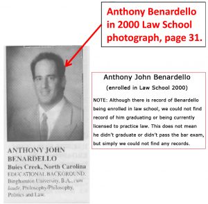 The photo is from the 2000 Campbell Law School yearbook but I don’t think it is the senior section. He claims he went there from 1998-2000. We have no reason to doubt that claim. He also claims he graduated from Law School at UNC Chapel Hill, NC in 2001 but we could not substantiate that claim.