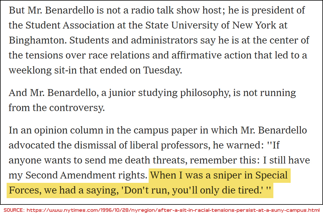 He was quoted in a school publication as saying he was a sniper in Special Forces and that reached the New York Times so eventually got a lot of publicity…