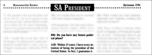 In a 1996 interview for another school publication, he guaranteed he would be elected to be the President of the United States in less than 25 years.