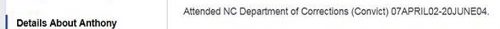 “Attended NC Department of Corrections (Convict) 07 April 02 to 20 June 04”