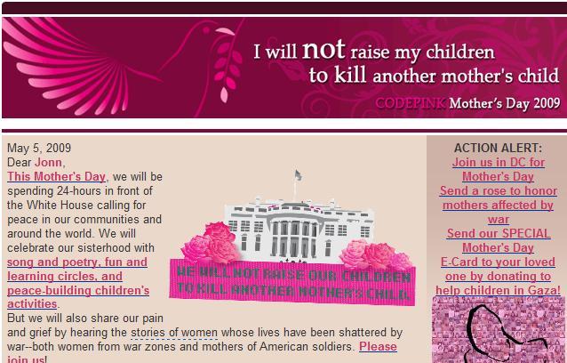 Oh, how the Left fell hard for Obama – he repeated all of the anti-war slogans they wanted to hear and the protest groups generally sat quietly through the election process last year with their hands folded on their laps. But, as reality has slapped the Obama Administration, it also slaps the anti-war movement. Last year, Code Pink was relegated to DuPont Circle for their annual Mothers Day protest, nine blocks from the White House, when in previous years they’d had the free run of Lafayette Park across the street. This year they’re back in Lafayette Park promising to not raise children that are raised to not kill other mothers’ children;