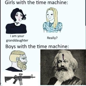 One of the memes making its rounds is the “boys versus girls time travel” meme. The top panel is what girls would do. The bottom panel is what boys would do. In this meme, the woman finds her grandmother as a younger woman. In the bottom panel, the man goes back in time and smokes Karl Marx. Enjoy your weekend.