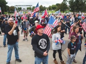 The group marched from near the Cathedral of Saint Paul to the Capitol grounds, singing and carrying flags. Some in the crowd carried long guns and wore body armor.
