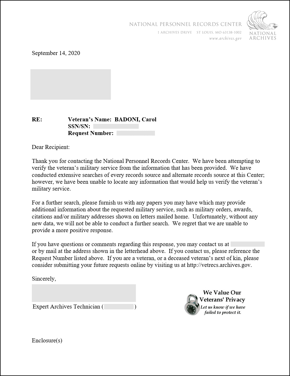 The folks at NPRC said “Who?”