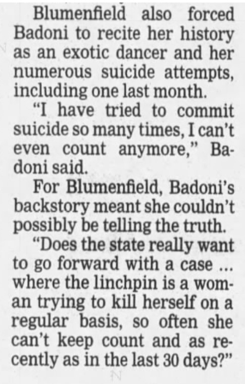 Also, there was a murder trial in 2008 where she was a key witness, but the prosecutor confirmed that she had bad credibility with telling the truth.  It came out that she was a mistress-lover to a murderer, she was a stripper, and she tried to commit suicide so many times that she lost count.  For context, Blumenfield was an attorney in the case.