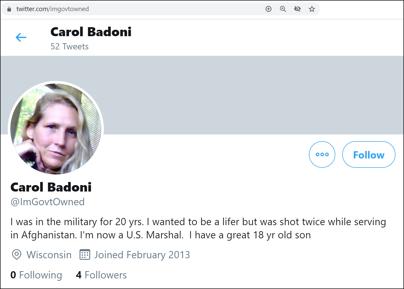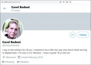 Having been shot twice while in the military is a claim that Badoni makes on her Twitter profile.  This, in addition to claiming she served in the military for 20 years and is currently a U.S. Marshall.