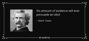For the record, the quote “no amount of evidence will ever persuade an idiot,” while true, was never said by Twain. A spokesperson for the “Mark Twain House & Museum” and a consultant for the “Center for Mark Twain Studies,” both say that the quote from any of Twain’s “known works, letters, or speeches”