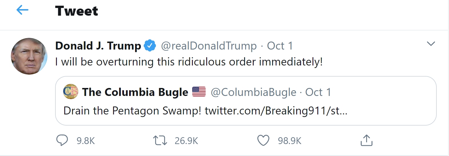 Trump tweeted, “I will be overturning this ridiculous order immediately!” linking to a tweet referencing the original American Military News story.