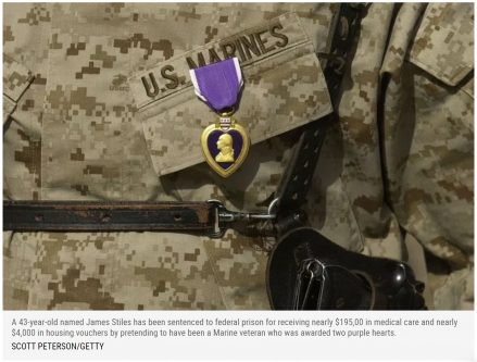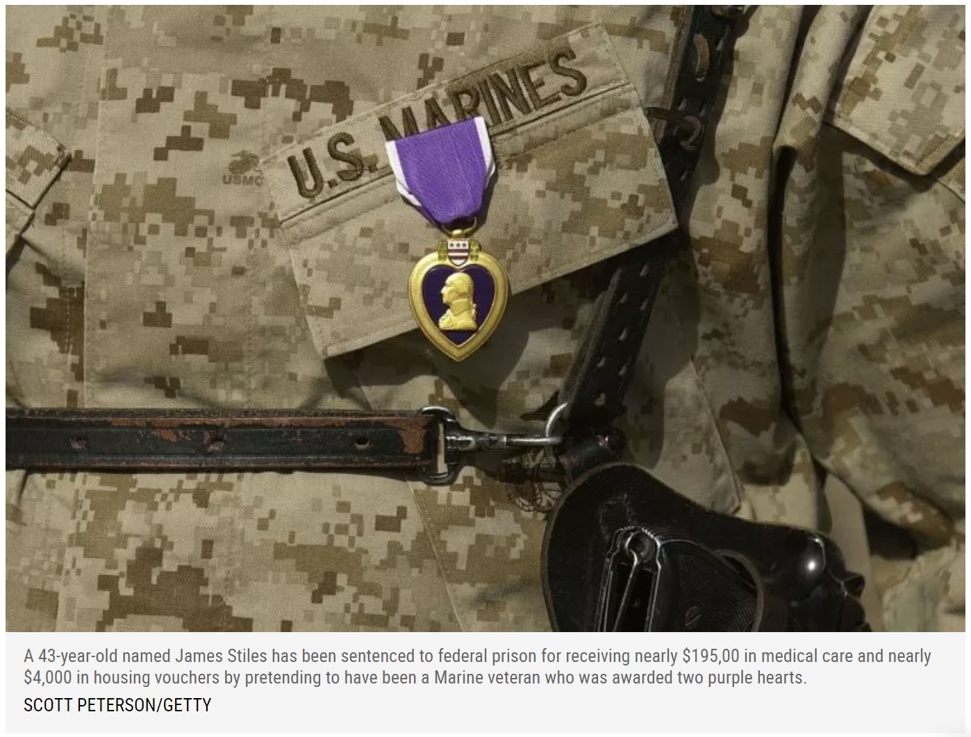The Marine Corps Times and Newsweek report that a man was sentenced to 16 months in federal prison for claiming to be a Marine that was wounded twice in combat; then using these claims to fraudulently obtain medical and other benefits. The man, James Jonathan Stiles of Orange California, was also to ordered to pay over $150K in restitution.