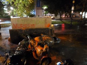 The group then turned to the nearby Abraham Lincoln statue, pulling it to the ground at 8:59 p.m. Spray-painted on the base of the statue was “Dakota 38,” a reference to 38 Dakota men executed after the Dakota-U.S. War of 1862, the largest mass execution in a single day in American history.