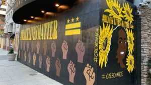 One photo showed the first and second-floor windows of one building boarded up and spray painted to include artwork in support of the Black Lives Matter movement. Wells Fargo, Francesca’s, CVS Pharmacy and Washington Sports Club were among some of the business with plywood protecting their windows.