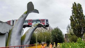 This would look strange if it wasn’t 2020. The driver of a metro train escaped injury when the train’s front car rammed through the barrier at the end of an elevated section of rails, and was caught by a sculpture of a whale’s tail near Rotterdam.