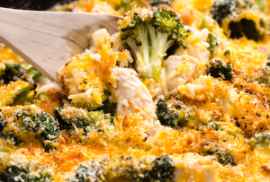 4) Drain chicken and add to broccoli mixture. Mix well. Pour into the prepared baking dish and spread evenly.
