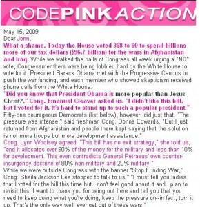 The gals at Code Pink aren’t feeling the love these days. Apparently, they’ve decided to take the unpopular position of forcing Obama to withdraw from Afghanistan by trying to convince Congress to vote against the apprpriation bill for the Iraq and Afghanistan wars. They were told by Congressman Emanuel Cleaver “Did you know that President Obama is more popular than Jesus Christ?. I didn’t like this bill, but I voted for it. It’s hard to stand up to such a popular president.”