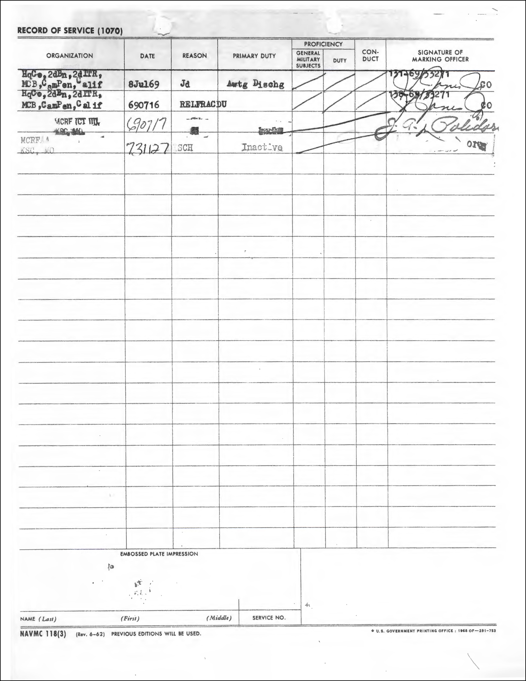 NOTE: Although a small few Navy and Marine Corps records were checked out and in the vicinity of the fire, “the present policy of NPRC is to state that there were no Navy and Marine Corps records destroyed in the fire and to treat these records as records that had been lost in ordinary circumstances.”