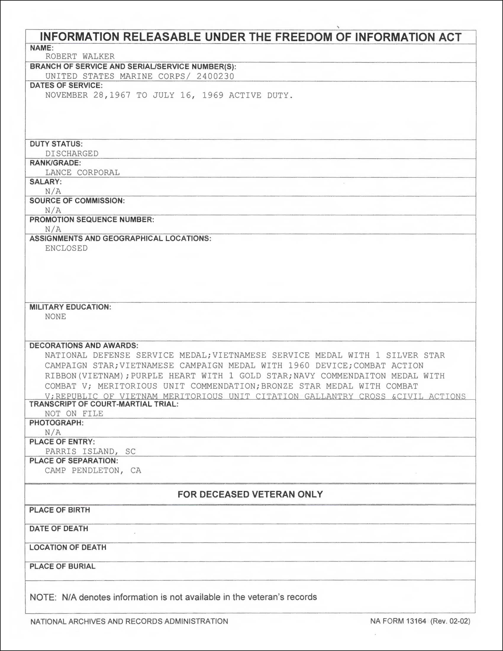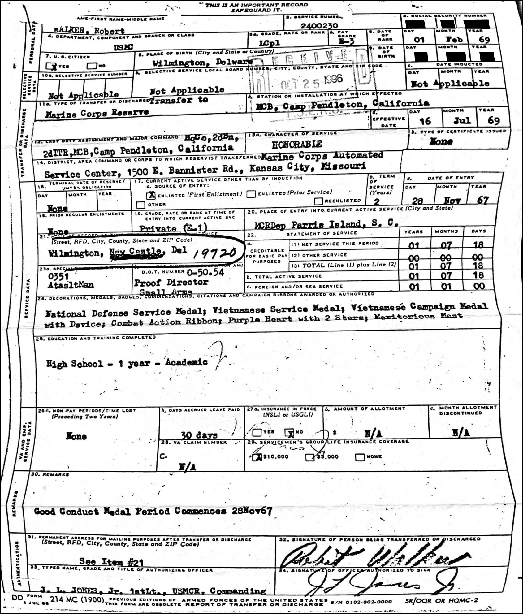 1) “MISSOURI FIRE” – Walker claims that his military records were affected by the “Missouri Fire” which we would take to mean the National Archives records fire of 1973. However, NO … I repeat … NO Marine Corps records were affected and NO records from Vietnam were affected.