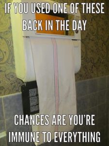 Oh, man, the bathroom roller towel thingy…. the picture alone brings back the smell of old disinfectant over unclean highway gas station bathroom. Most of them seemed to have run out of clean towel some days in the past. After about 3 hard yanks you know you ain’t getting clean towel and who knows who did what with that towel you just wiped your hands with. So you have to wash your hands again, but really really hard, then wave them around to fling off most of the water.