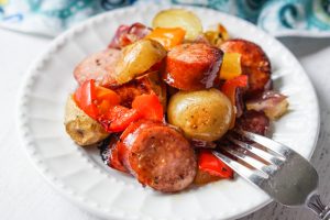 Any sausage (kielbasa, andouille, bratwurst, chorizo, etc.) work great here.
