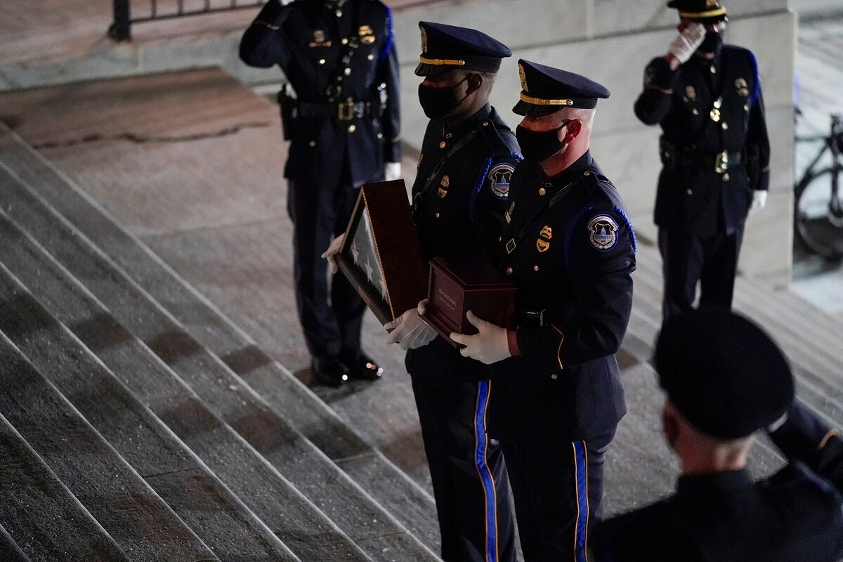 Officer Brian Sicknick, the US Capitol Police officer who died from injuries sustained in the rioting at the Capitol on 6 Jan, 2021, is lying in honor at the US Capitol.